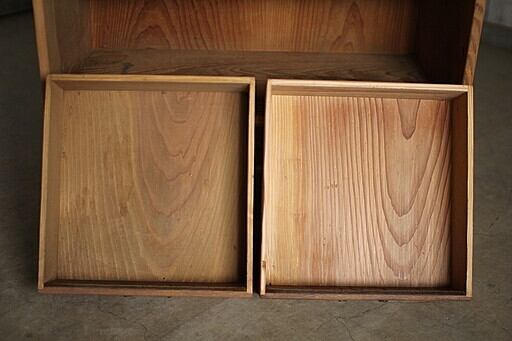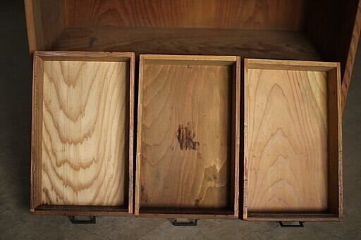 古い小ぶりな木枠のガラス戸棚×小引き出し5杯です。