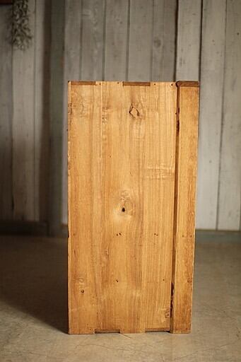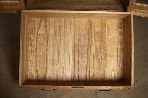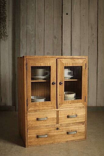 古い小ぶりな木製のモールガラス戸棚×木製小引き出し3段