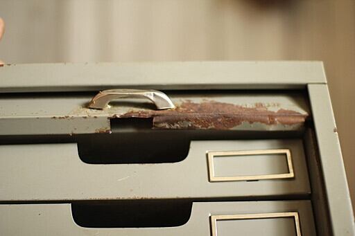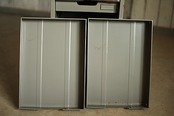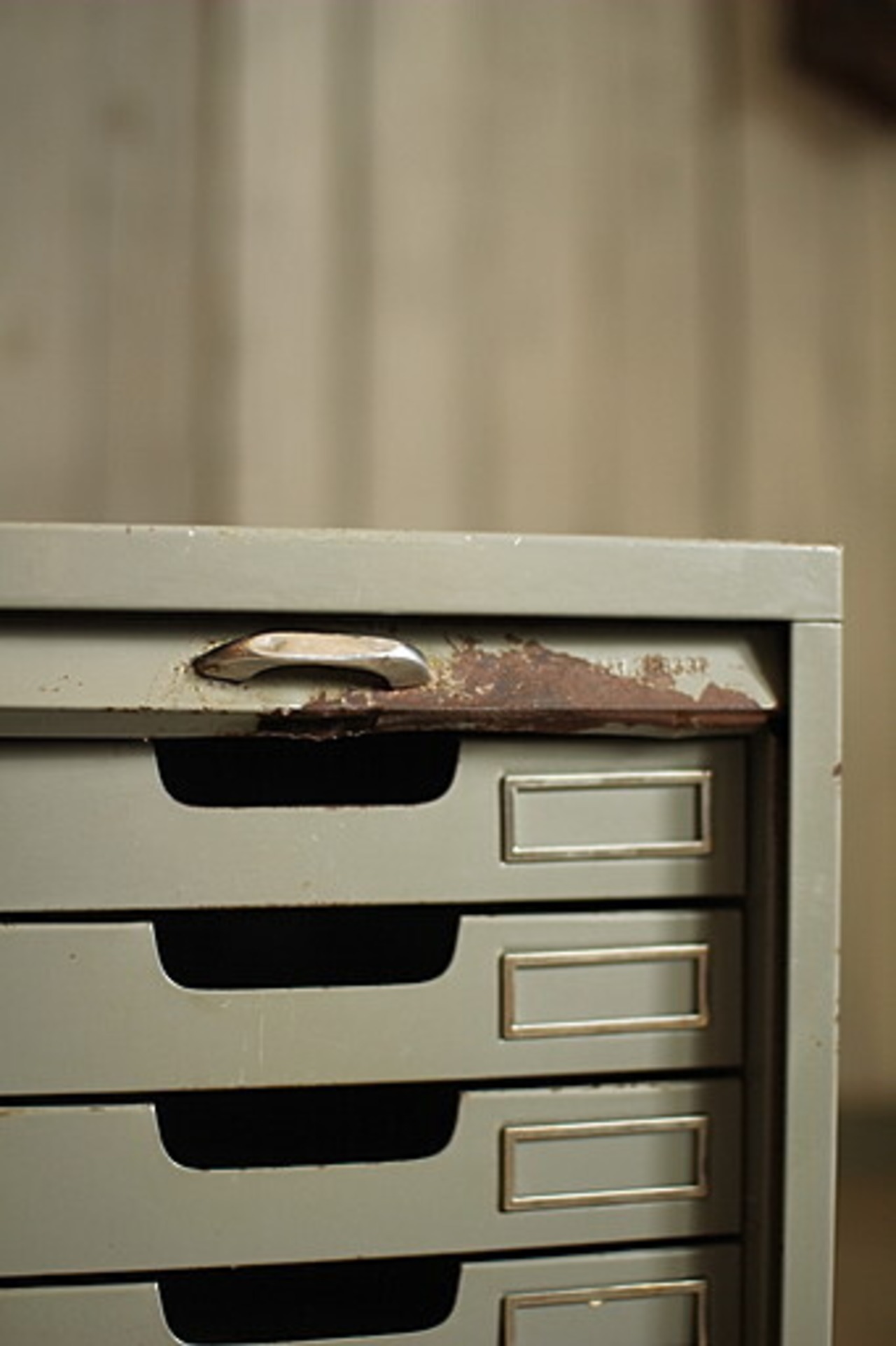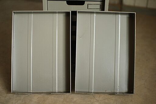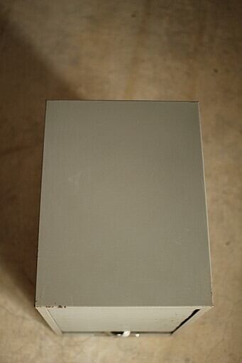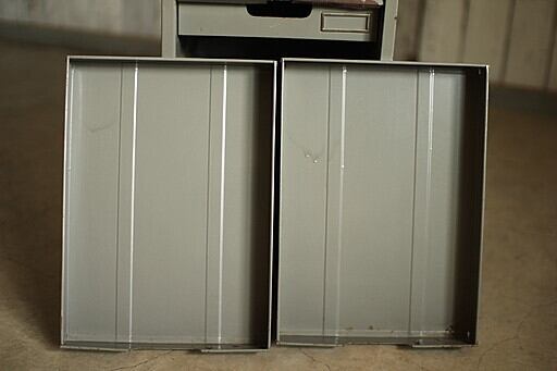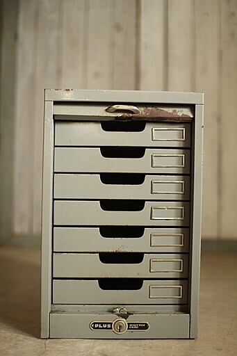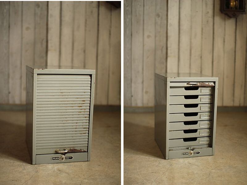 古いシャッター扉付きのスチール製書類棚 小引き出し7段