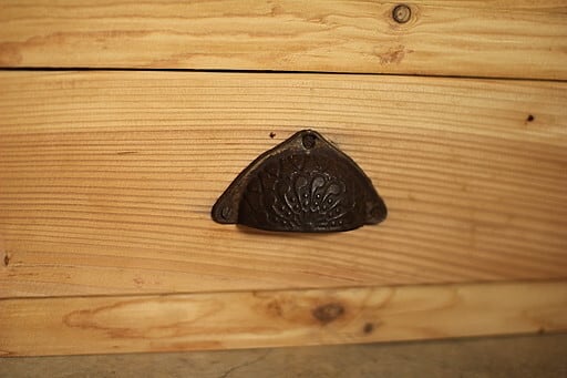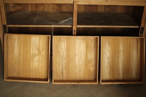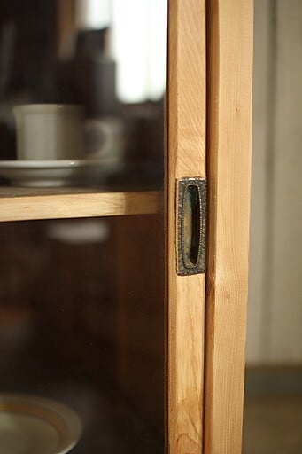 古い木枠のガラス戸棚 引き出し3杯 水屋