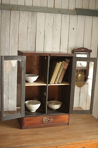 古い小ぶりな木製のガラス戸棚×小引き出し