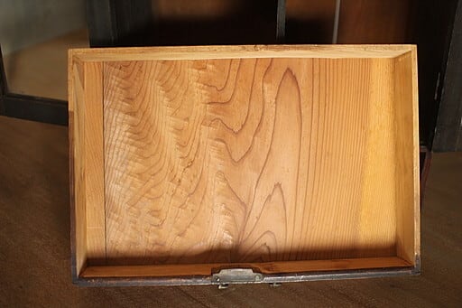 古い木製のガラス戸棚×小引き出しです。