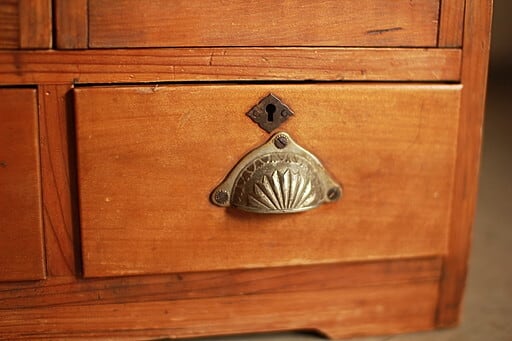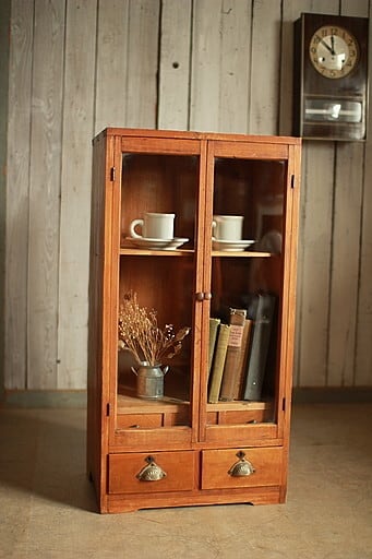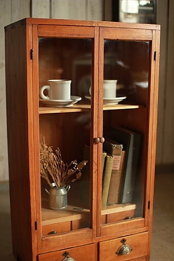 古い小ぶりな木枠のガラス戸棚 小引き出し5杯