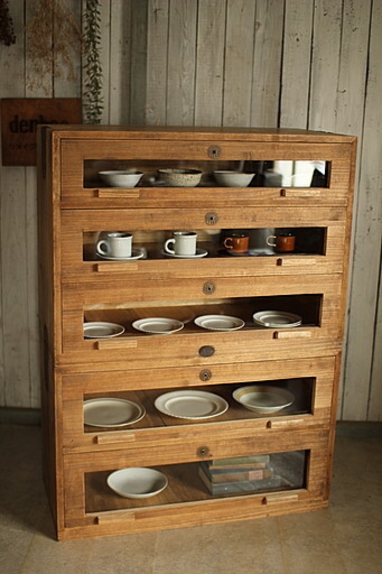 前面ガラスの木製引き出し2段です。