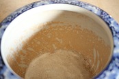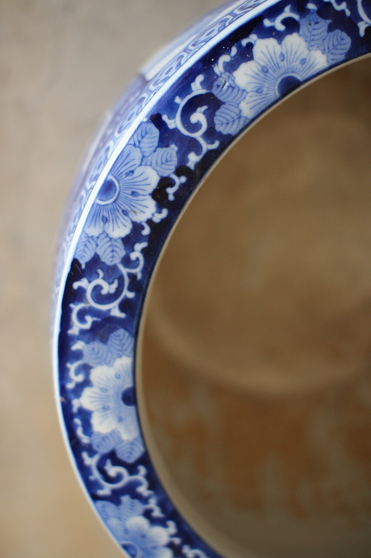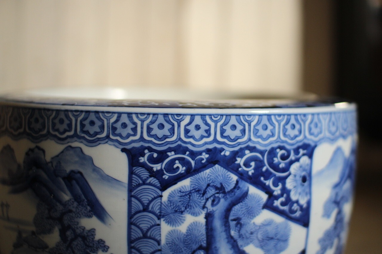 古い陶器製の火鉢 山水図 蛸唐草 睡蓮鉢