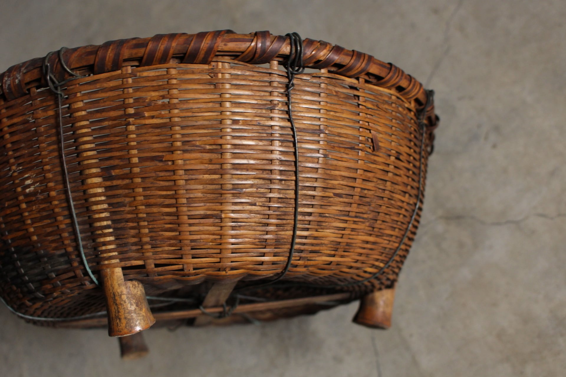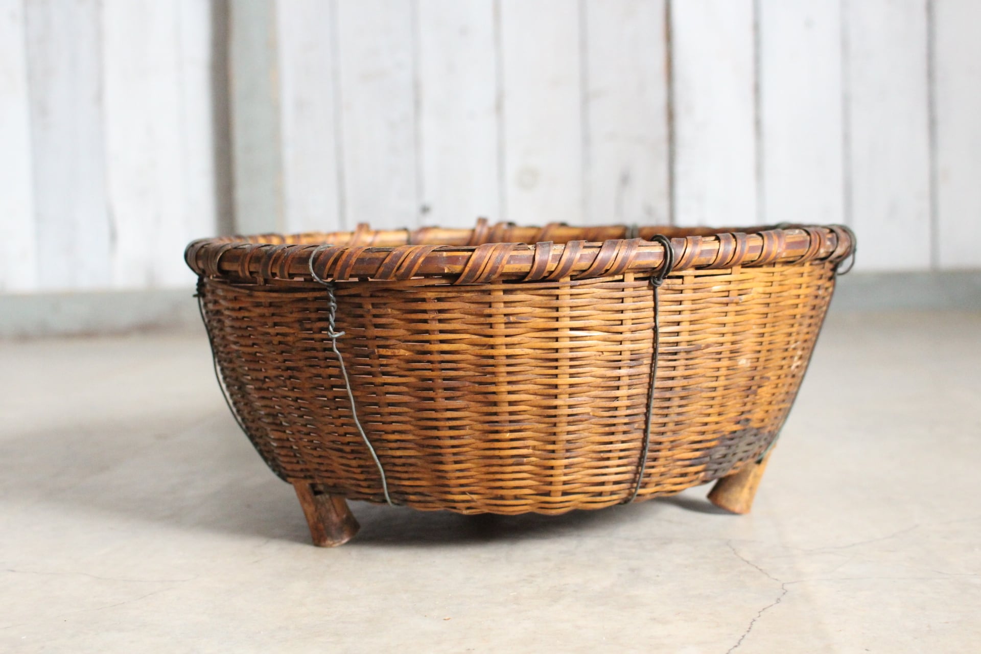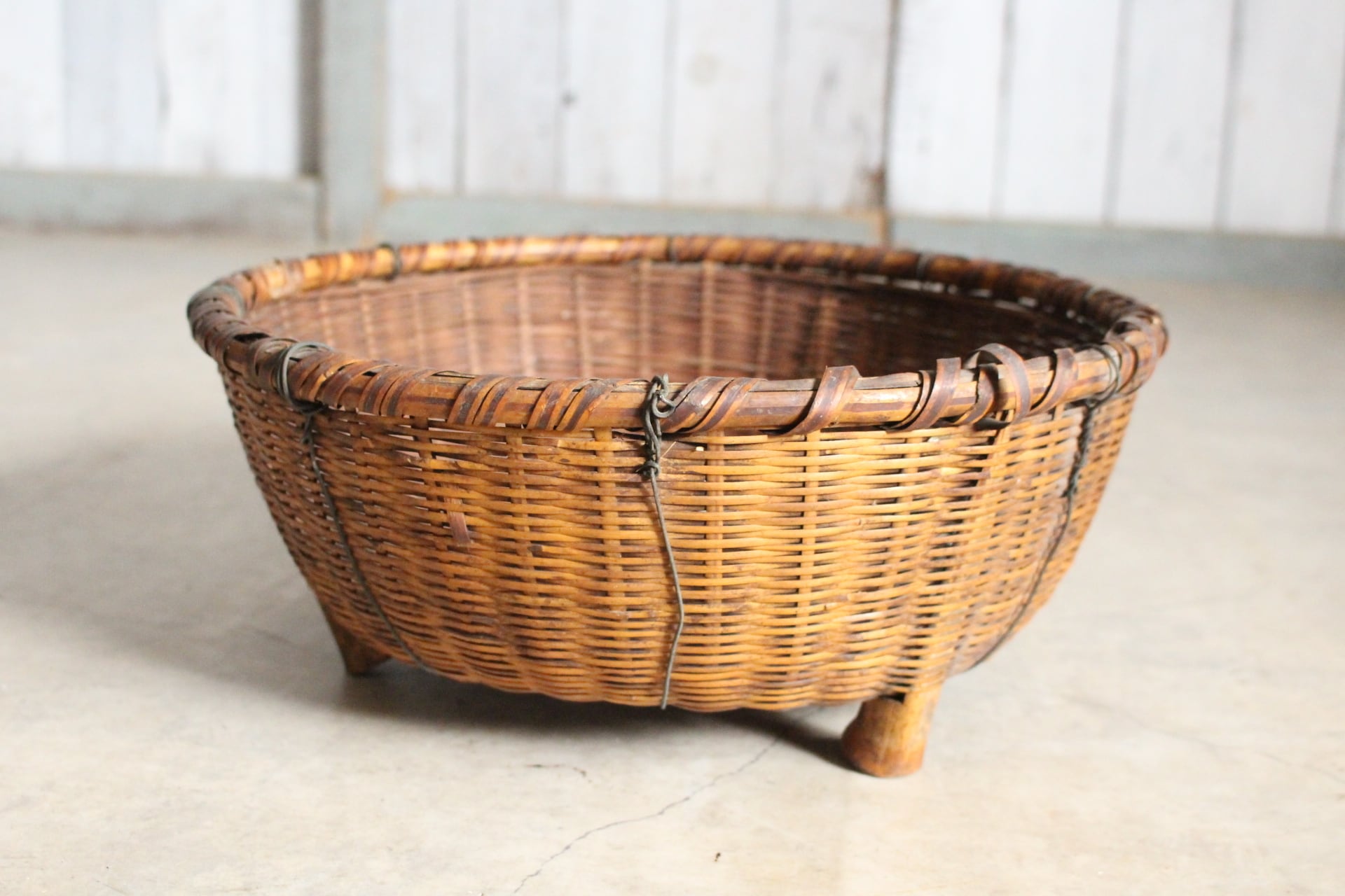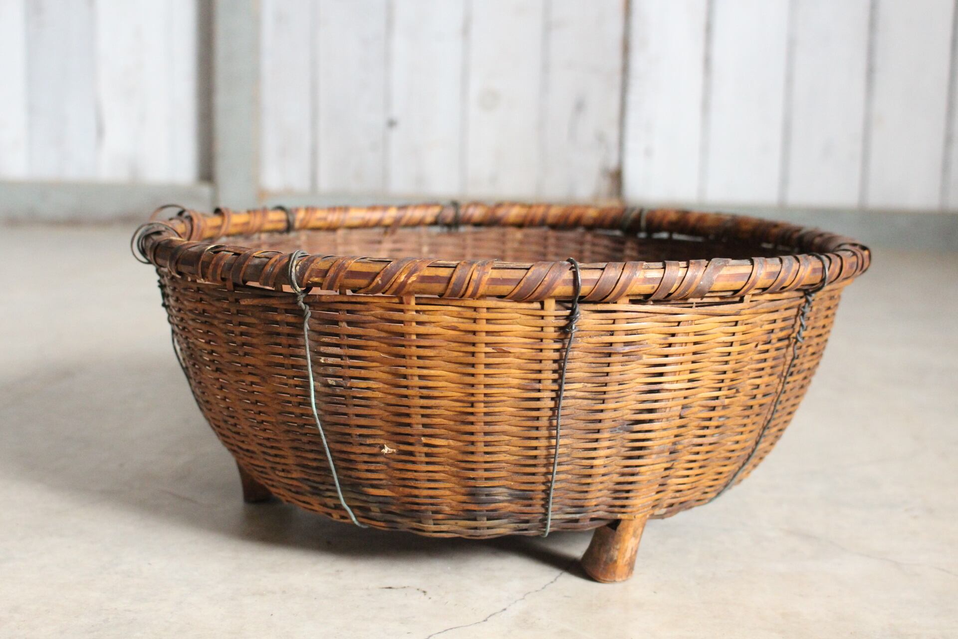 古く味のある竹かご 脚付き
