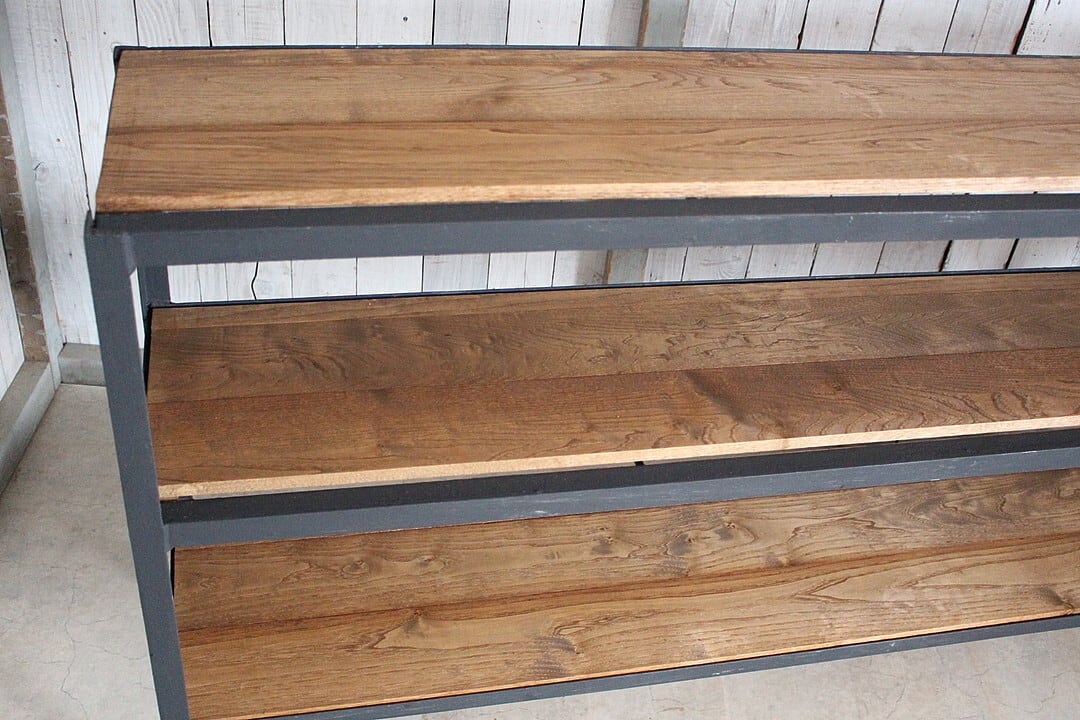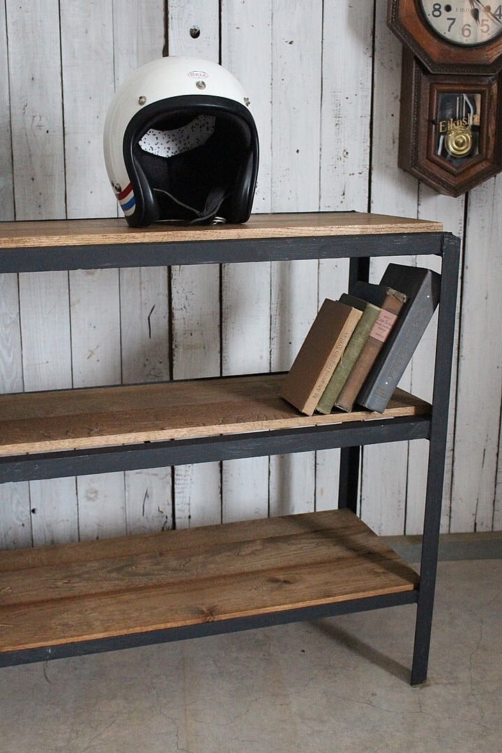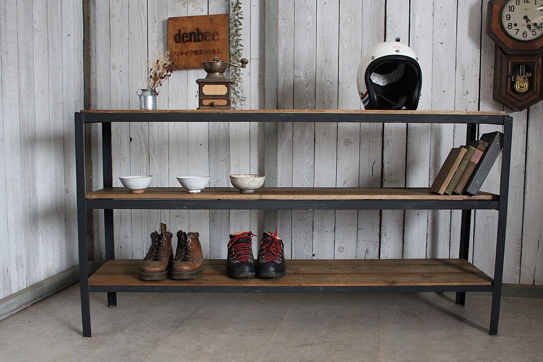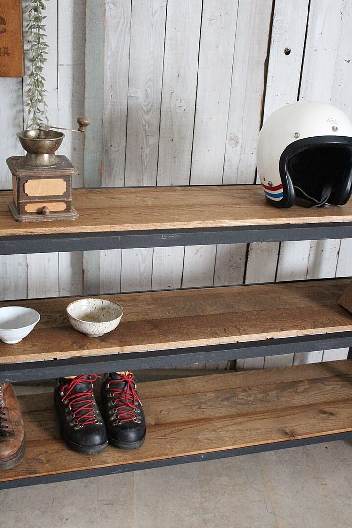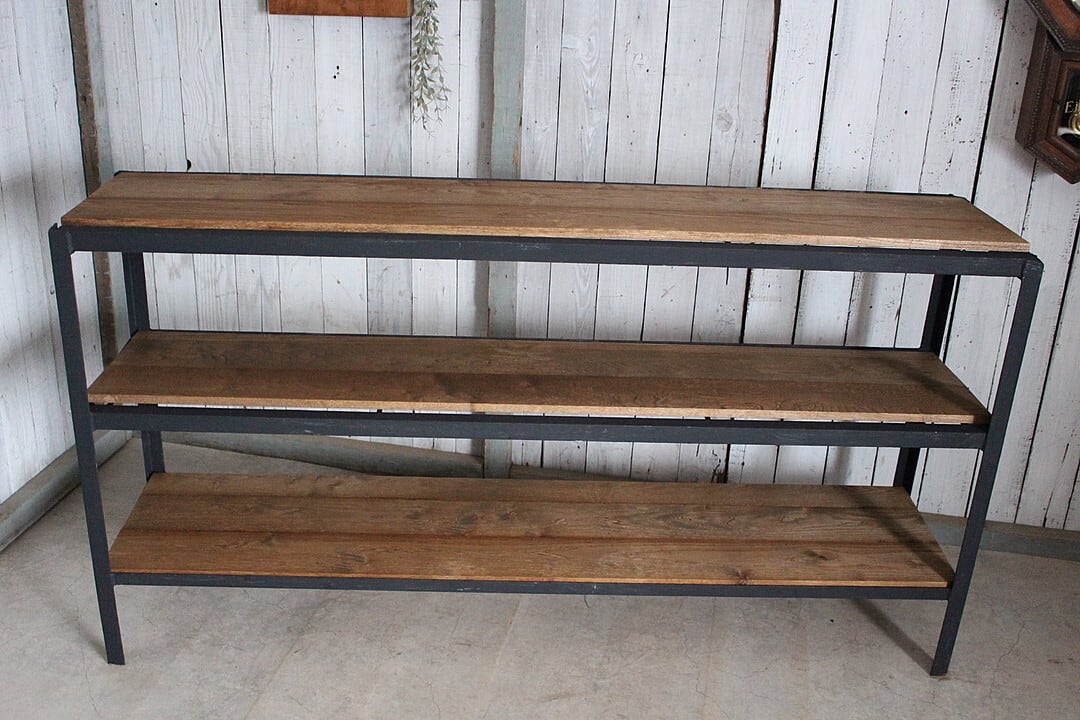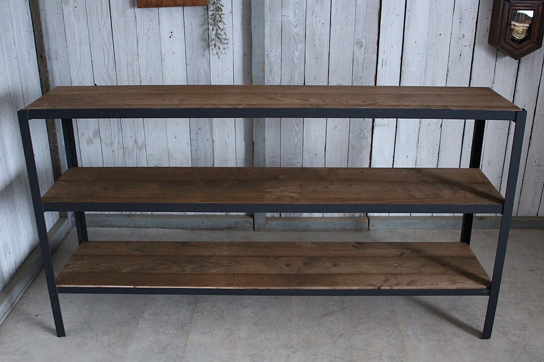 古いアイアンフレームと古材の収納棚