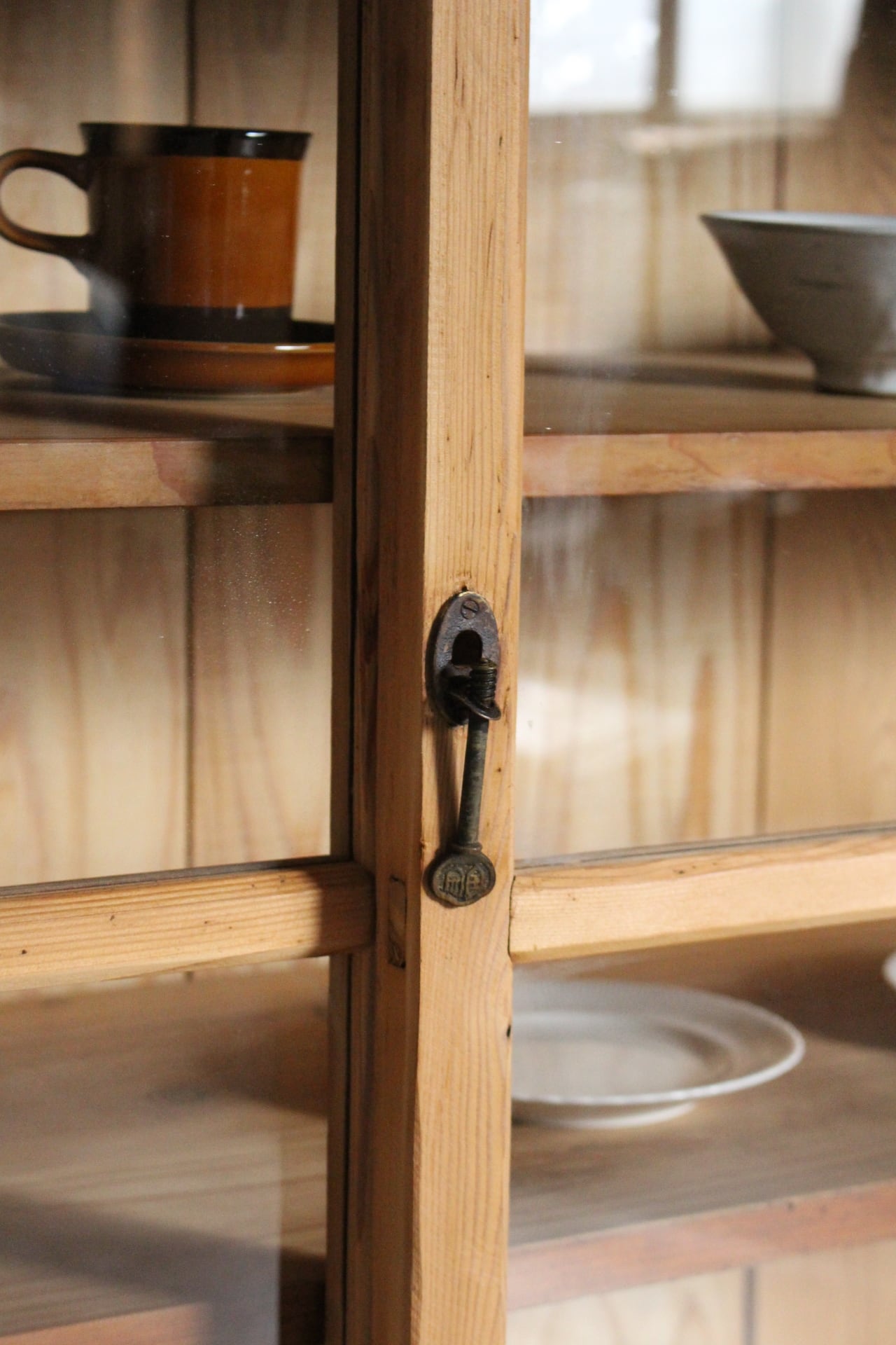 古い大きな木枠の格子ガラス戸棚