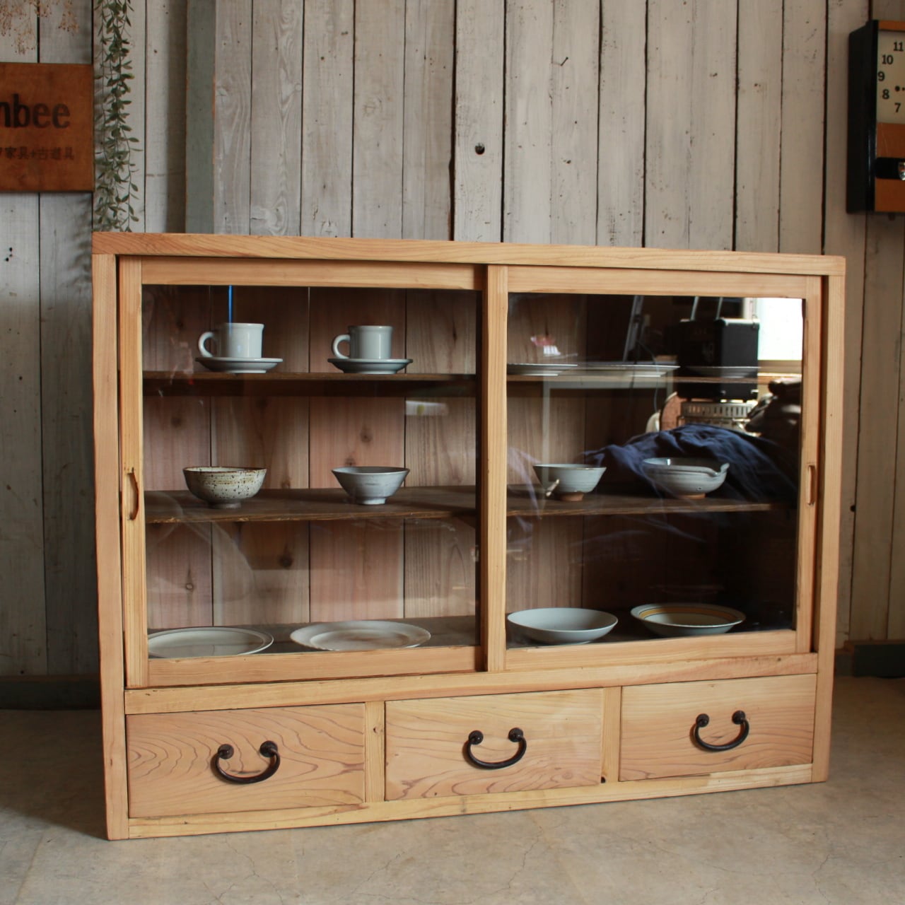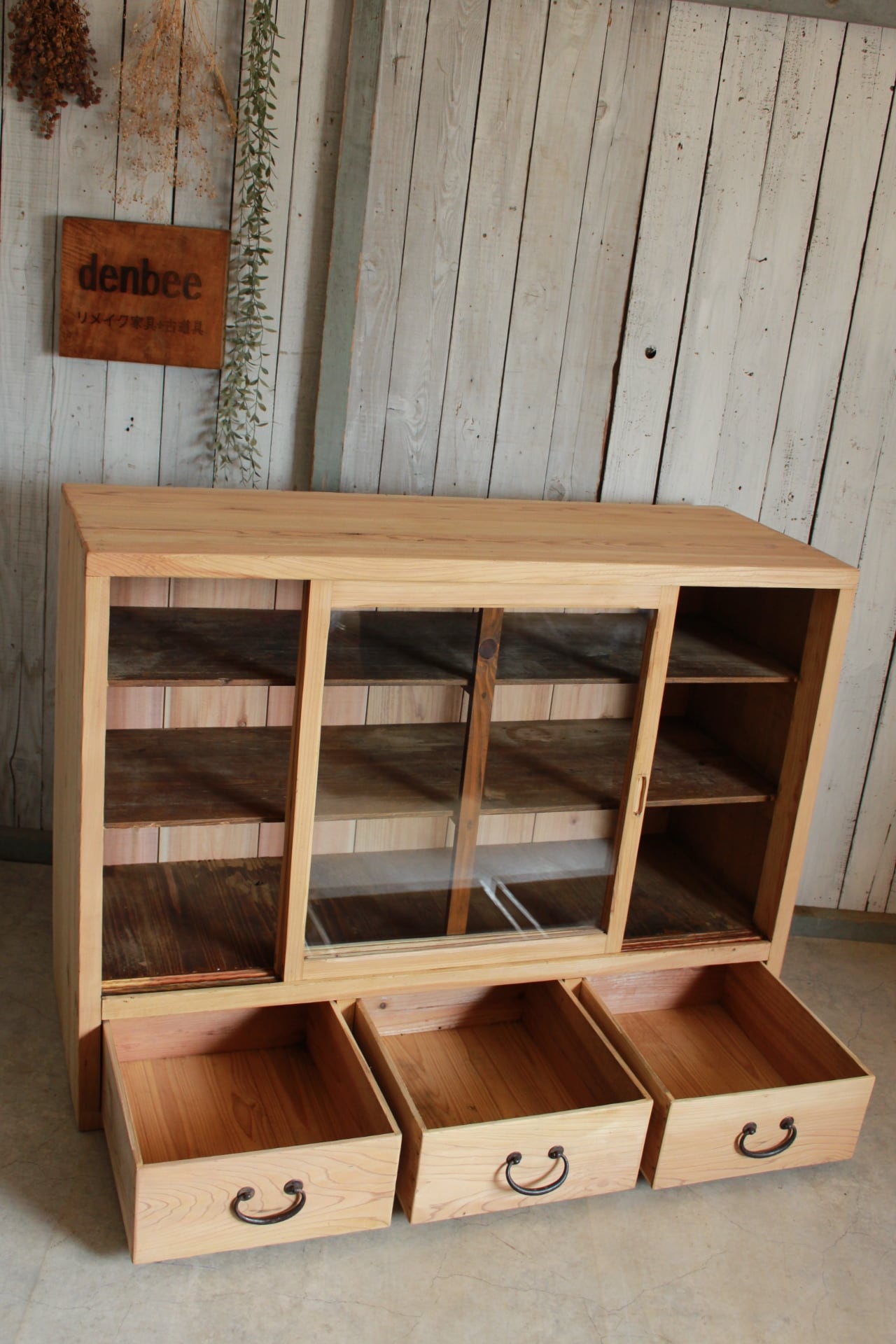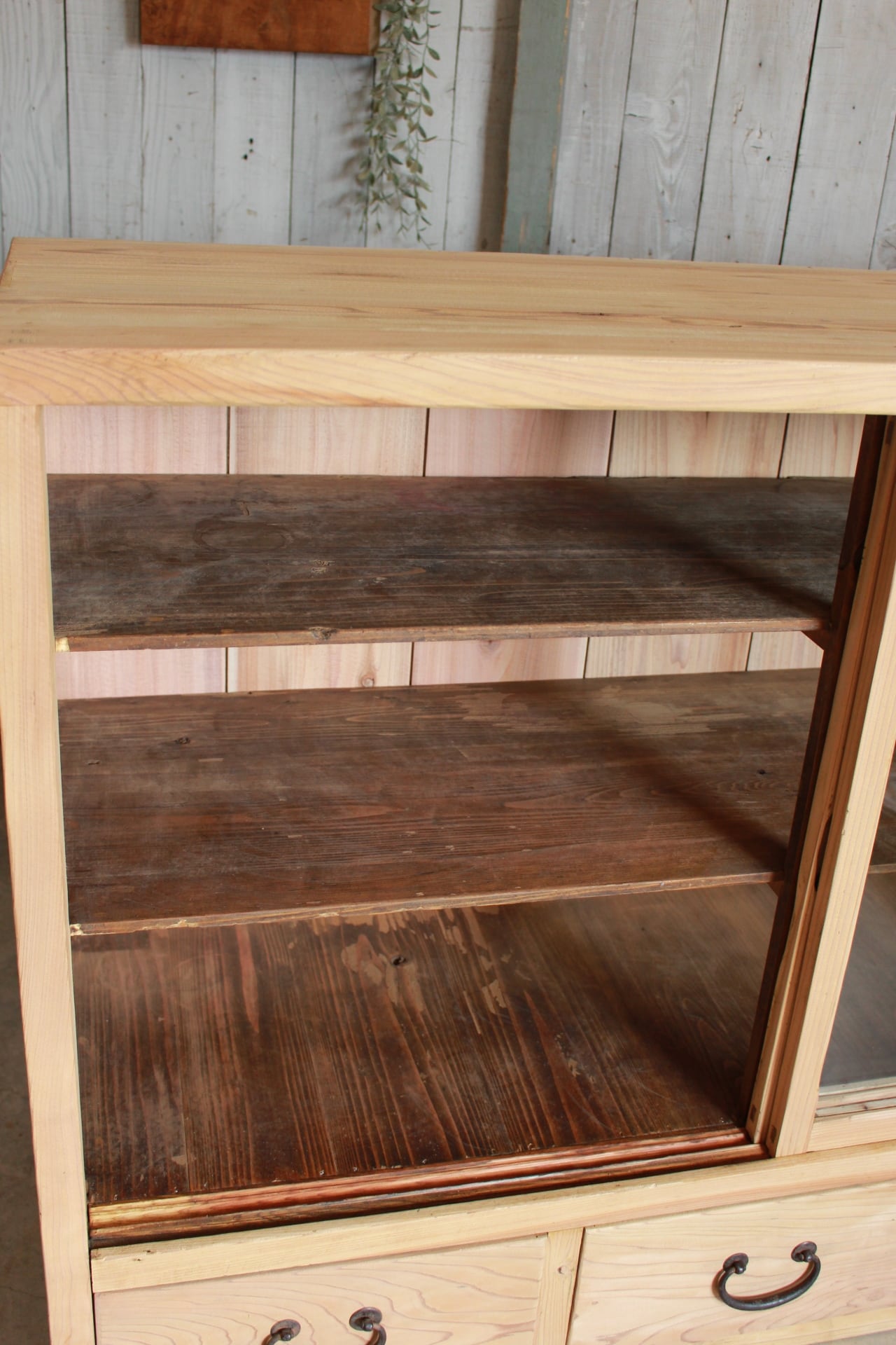 古い木枠のガラス戸棚 引き出し3杯 水屋