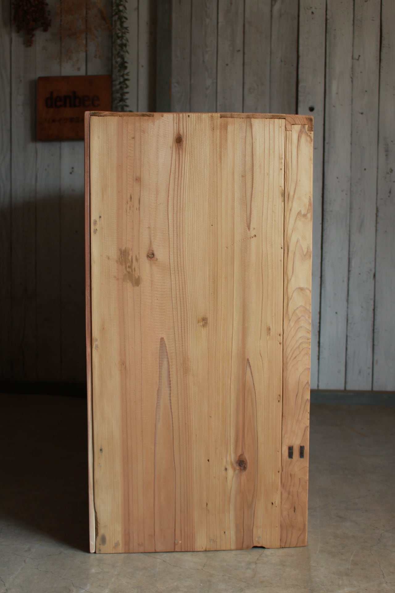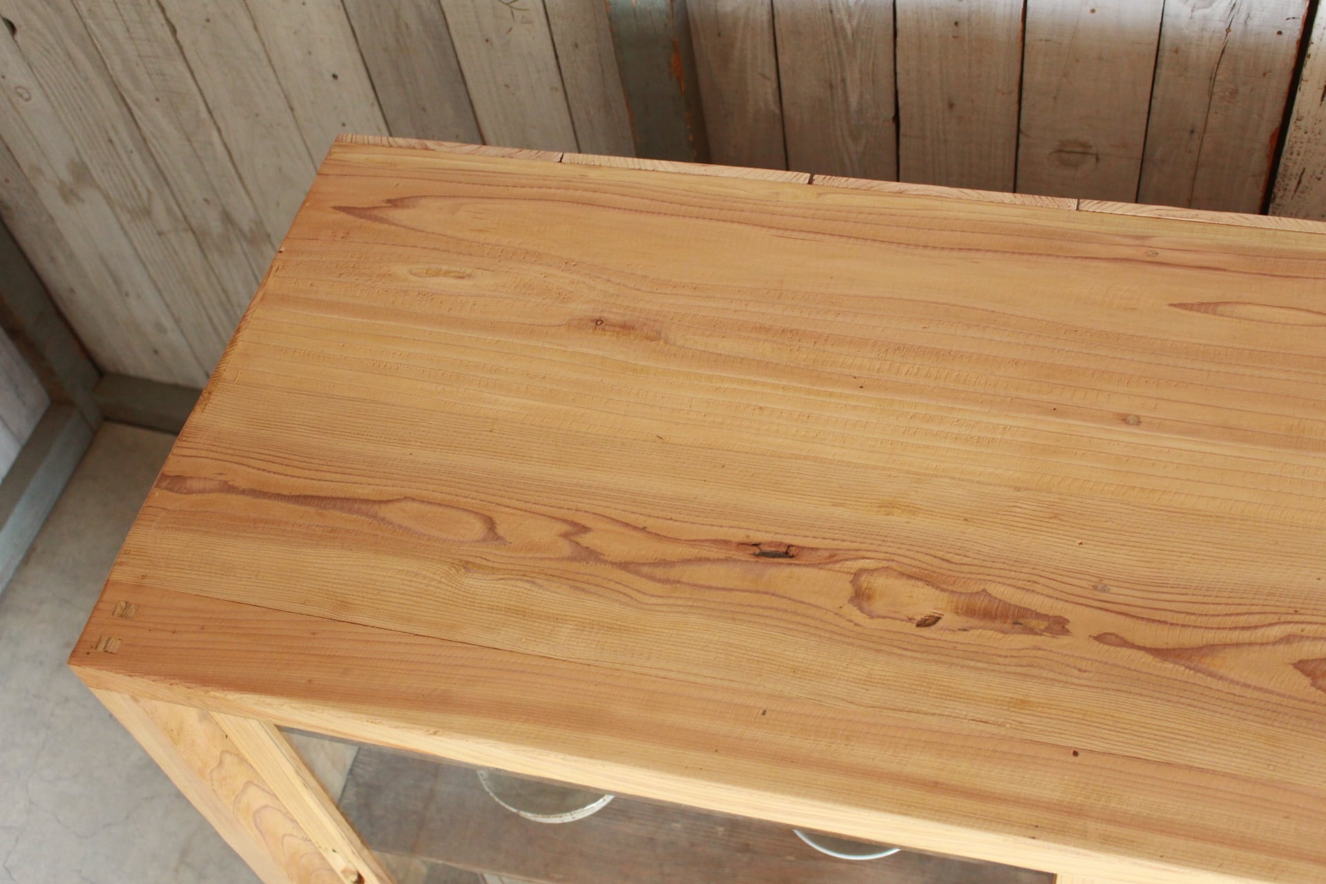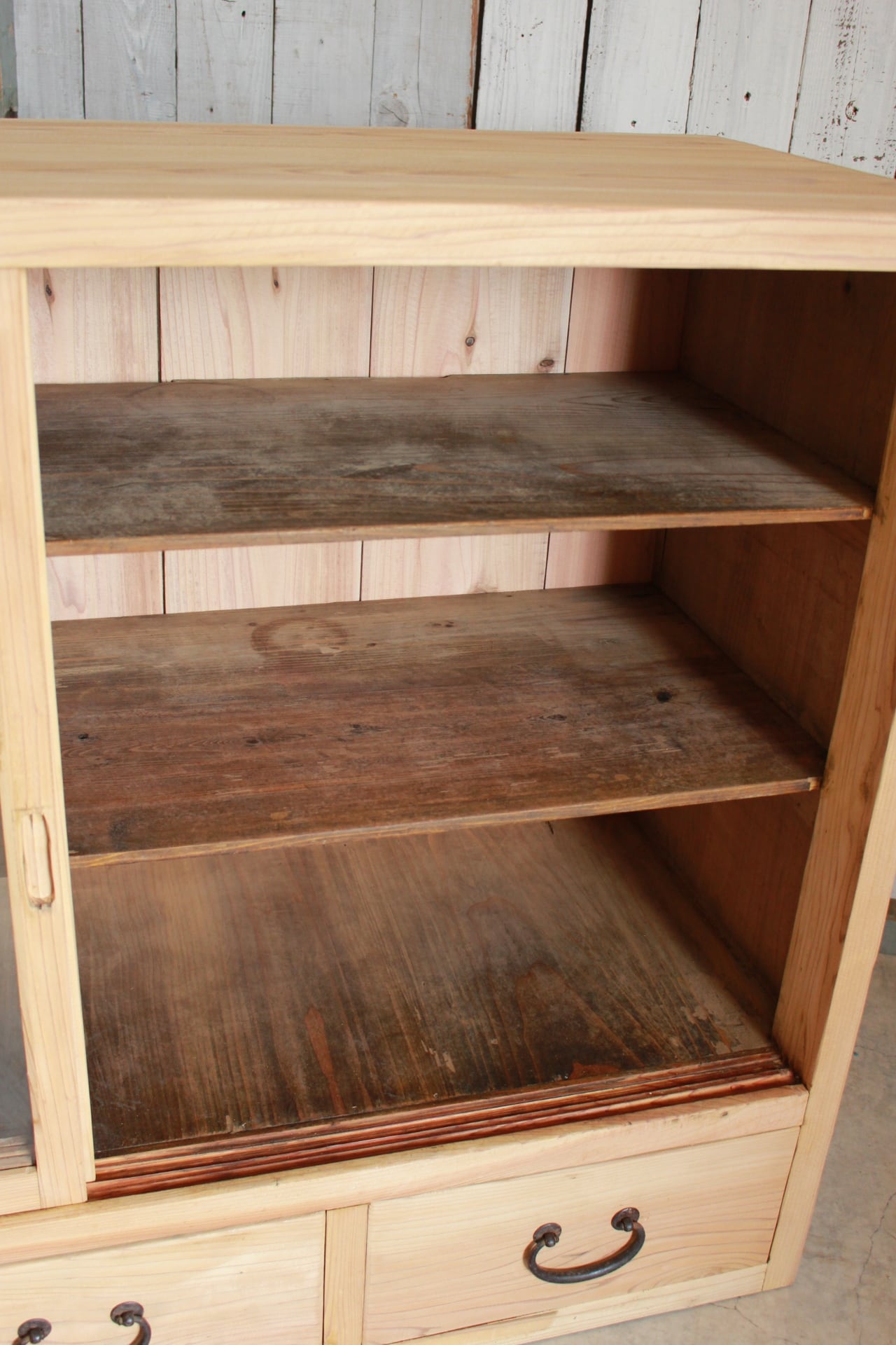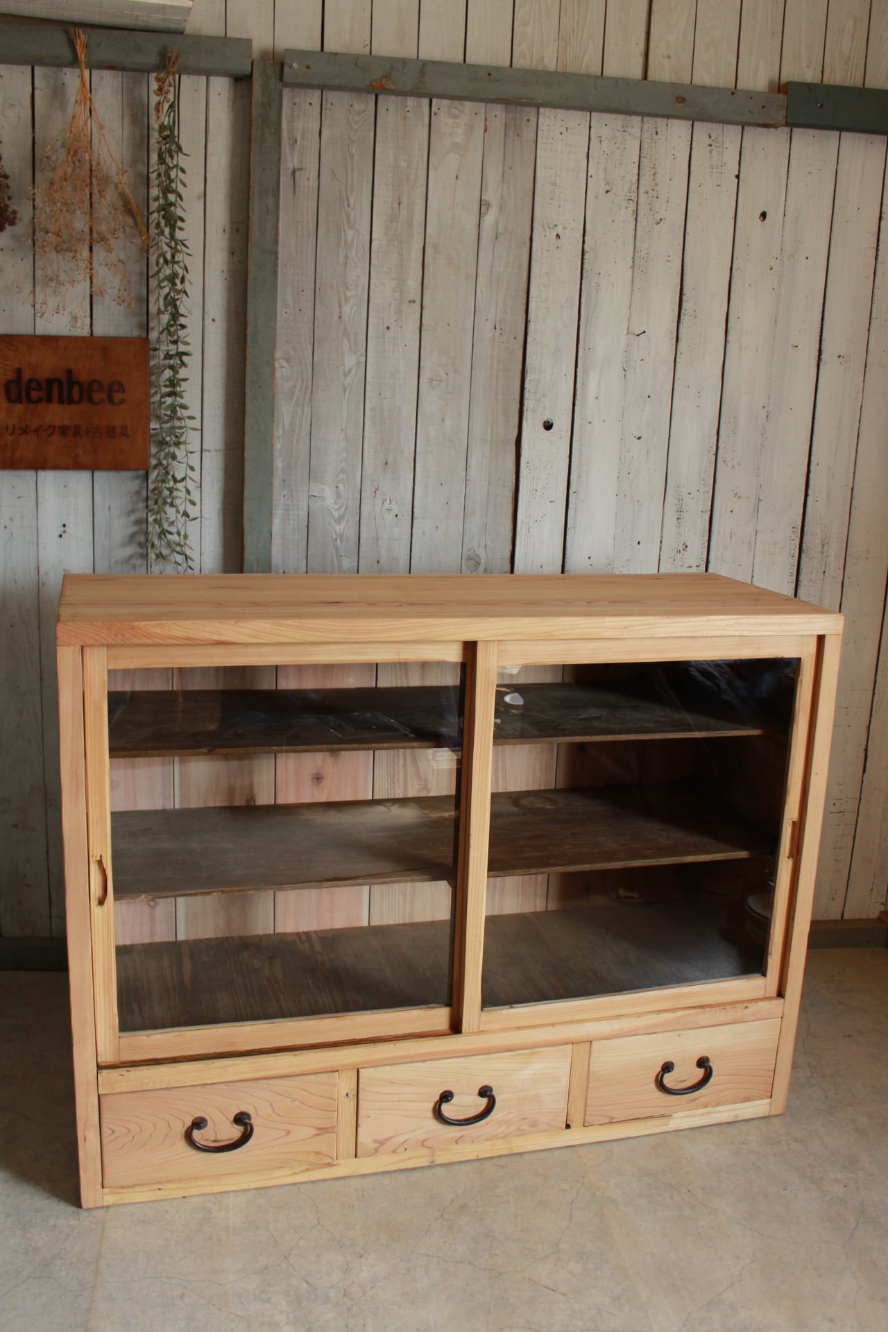 古い木枠のガラス戸棚 引き出し3杯 水屋
