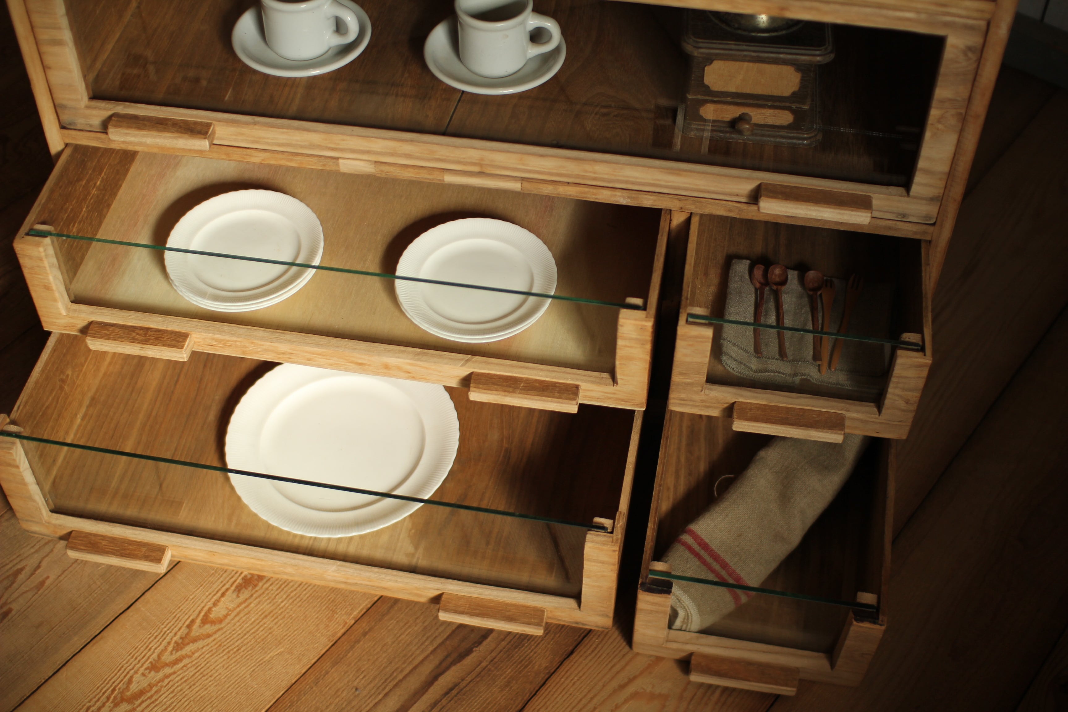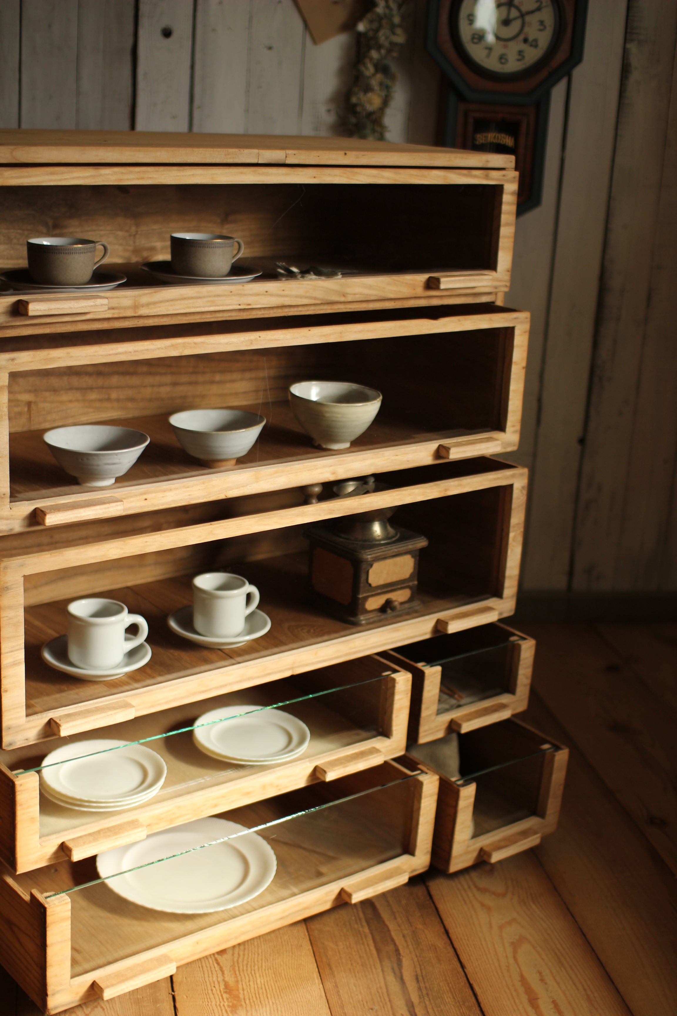 前面ガラスの木製引き出し7杯 シャツケース 食器棚