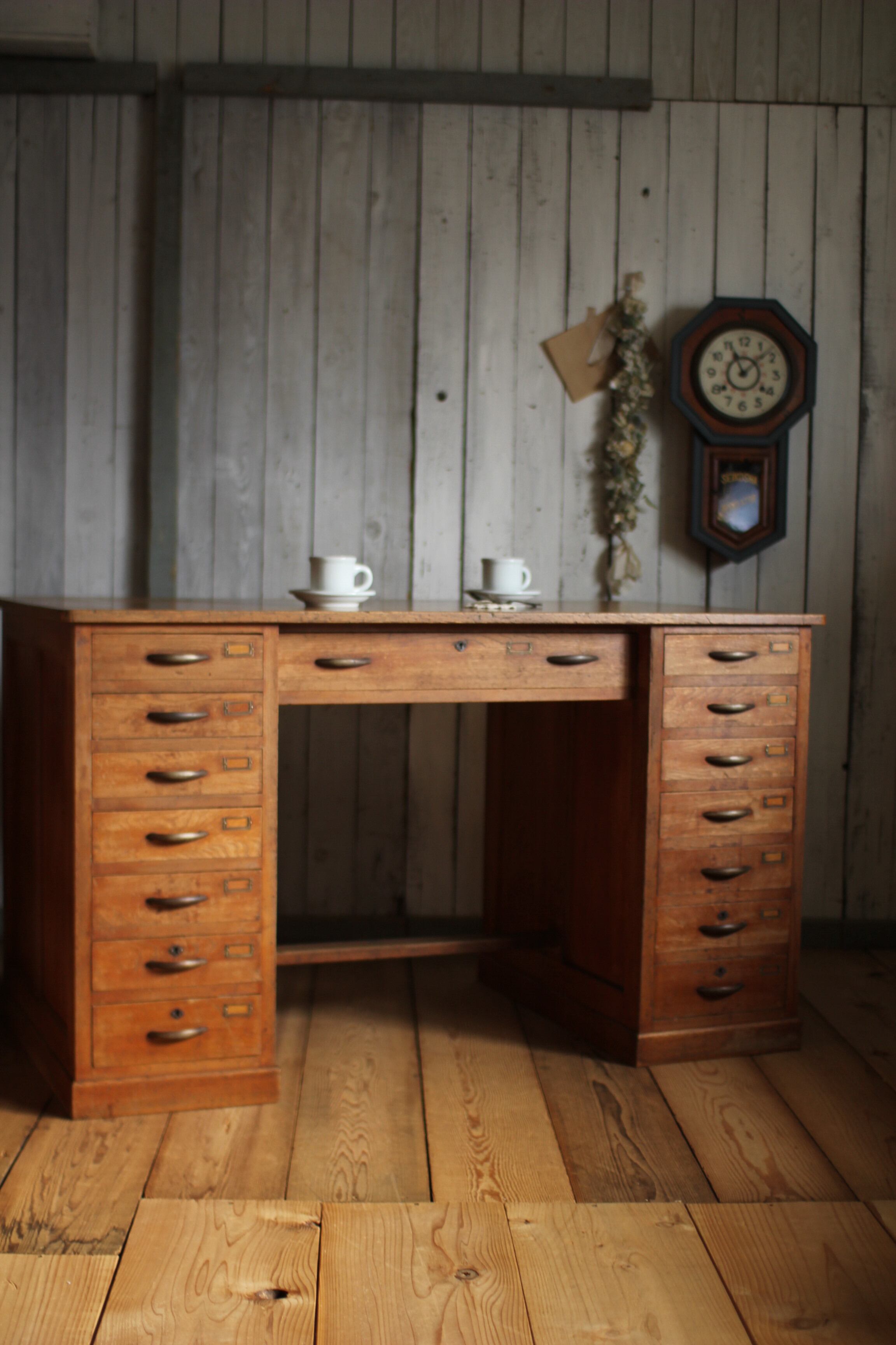 古い木製の両袖机 引き出し15杯