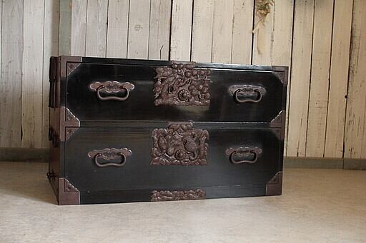 明治期の肉厚な打ち出し金具庄内箪笥です。