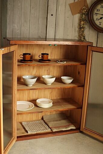 古いモールガラス戸の木製収納棚