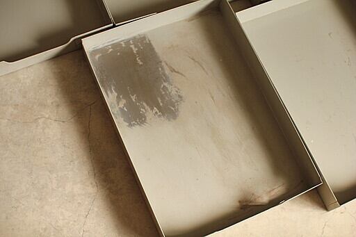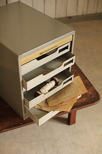 古いシャッター扉付きのスチール製書類棚 小引き出し5段