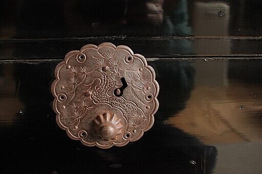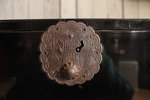 前面は黒漆塗で、天板、側板、背板は赤っぽい色の溜め漆塗りです。