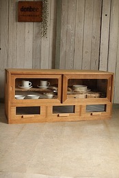古い木製のガラス戸棚×前面ガラスの引き出しです。