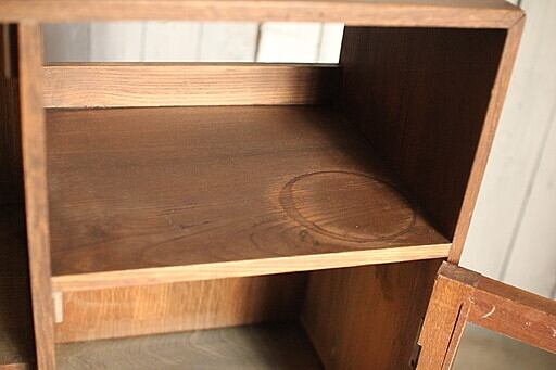 古い小ぶりな木枠のガラス戸棚 木製小引き出し2杯
