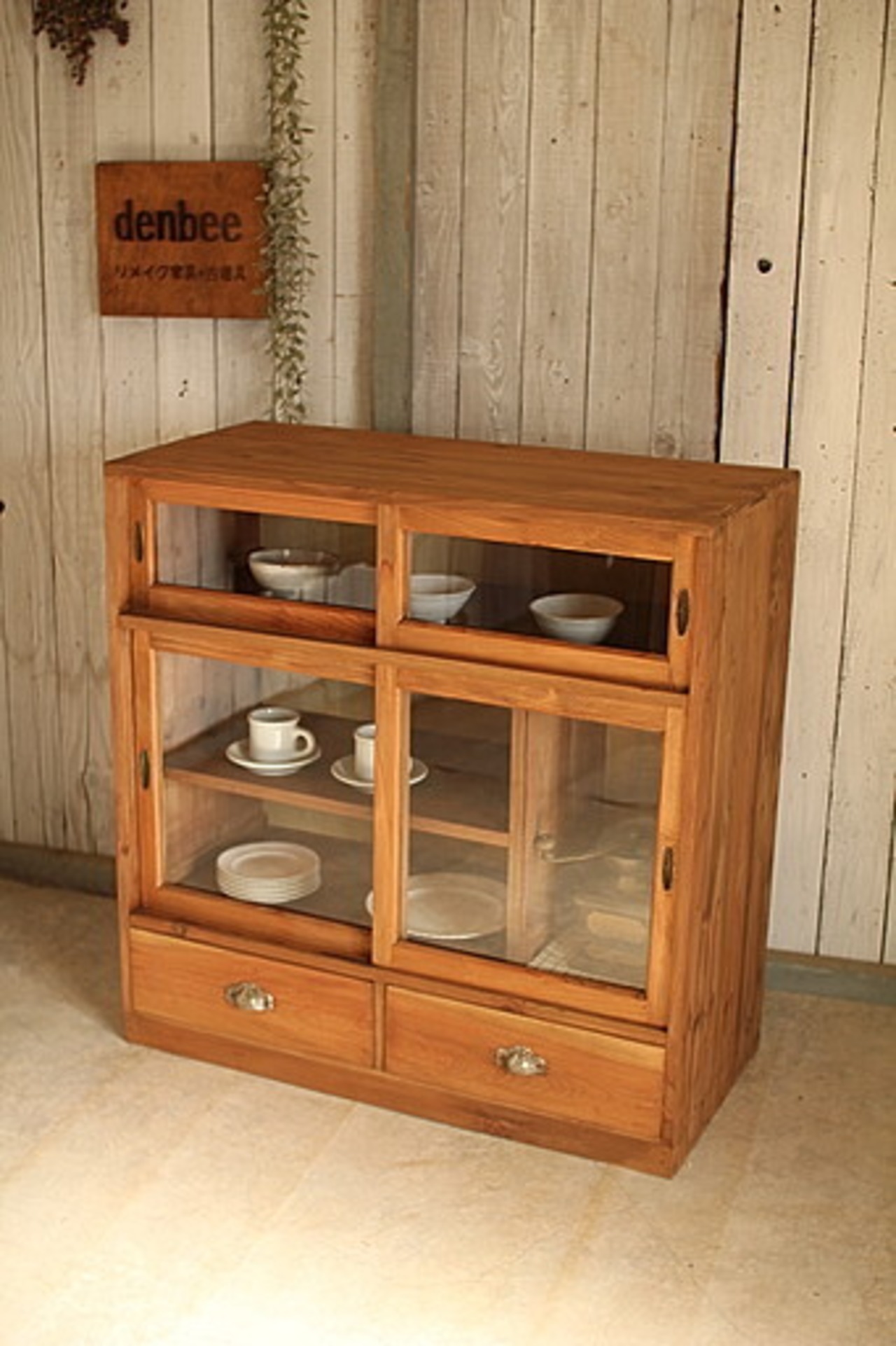 古い木製のガラス戸棚 引き出し2杯