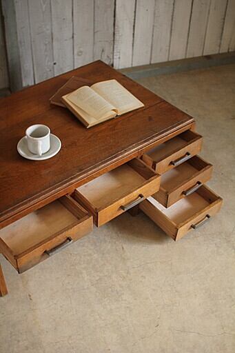 古い木製の片袖机 引き出し5杯