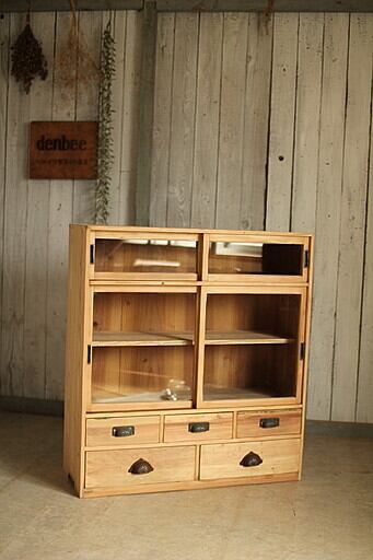 古い木製のガラス戸棚×引き出し6杯