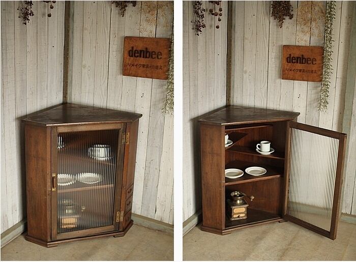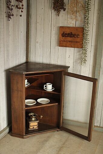 古いコーナーモールガラス扉の木製収納棚 小引き出し3段