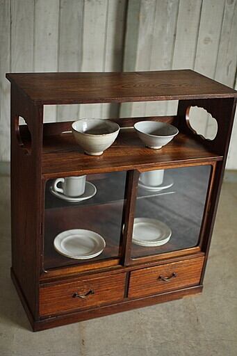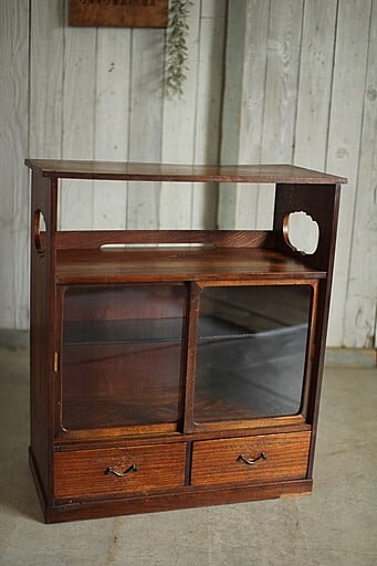 古い小ぶりな木製のガラス戸棚 引き出し2杯