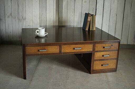 古い木製の片袖机 前楢材引き出し5杯