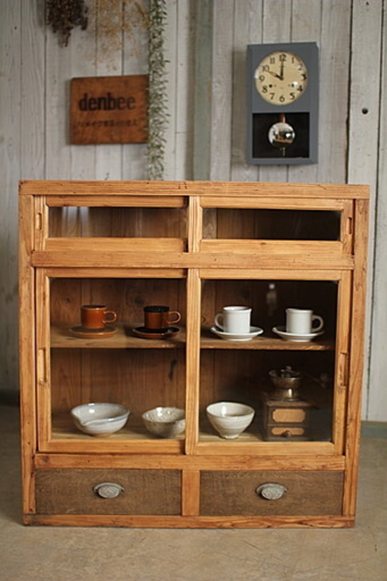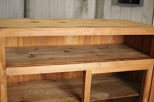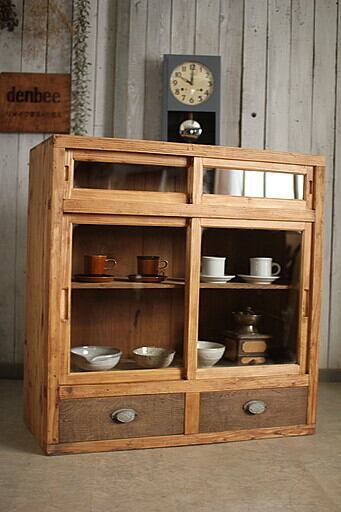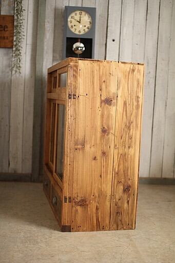 古い木枠のガラス戸棚 引き出し2杯
