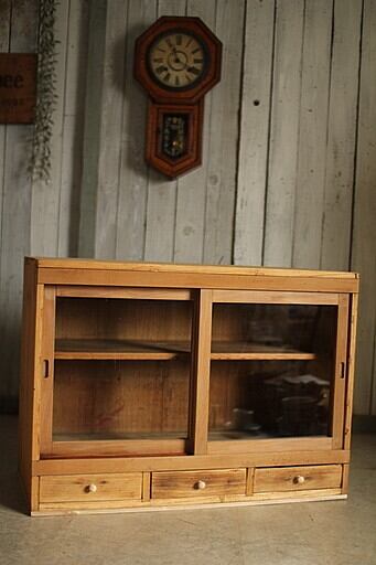 古い小ぶりな木枠のガラス戸棚 引き出し3杯