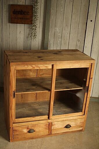 雰囲気の良い木枠ガラス戸棚 引き出し2杯