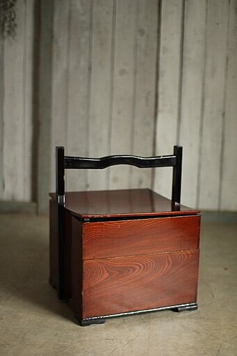 欅製の古い持ち手付きの木箱2段 岡持ち