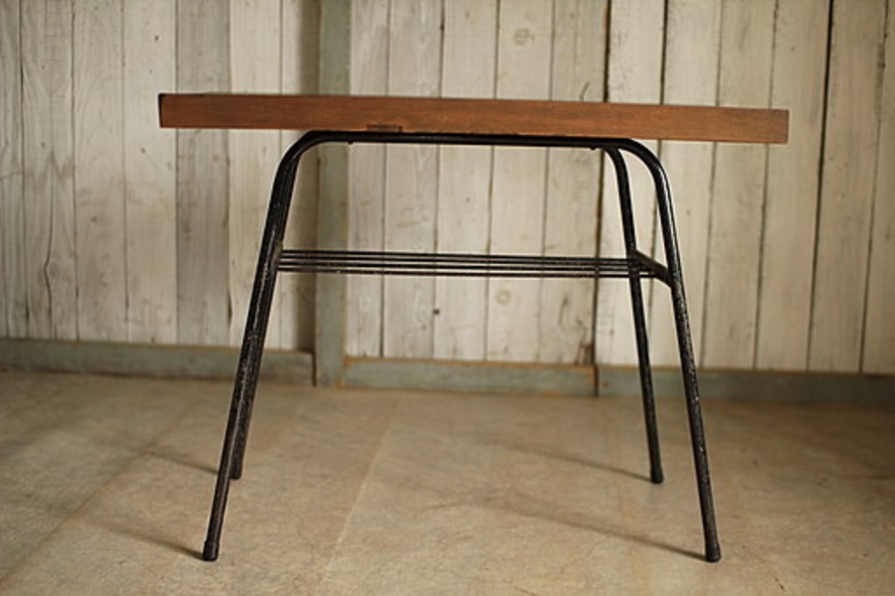 古い小ぶりな鉄脚と古材のテーブル 棚付き