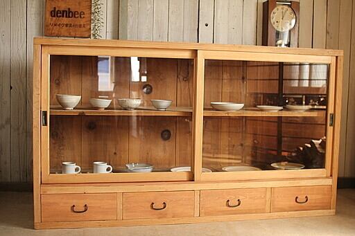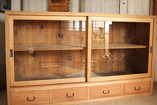 古い大きな木枠のガラス戸棚 引き出し4杯