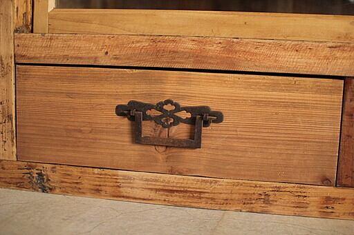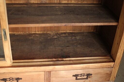 味のある大きな木枠のガラス戸棚 引き出し3杯