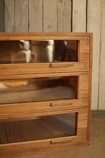 古い前面ガラス引き出し3段です。