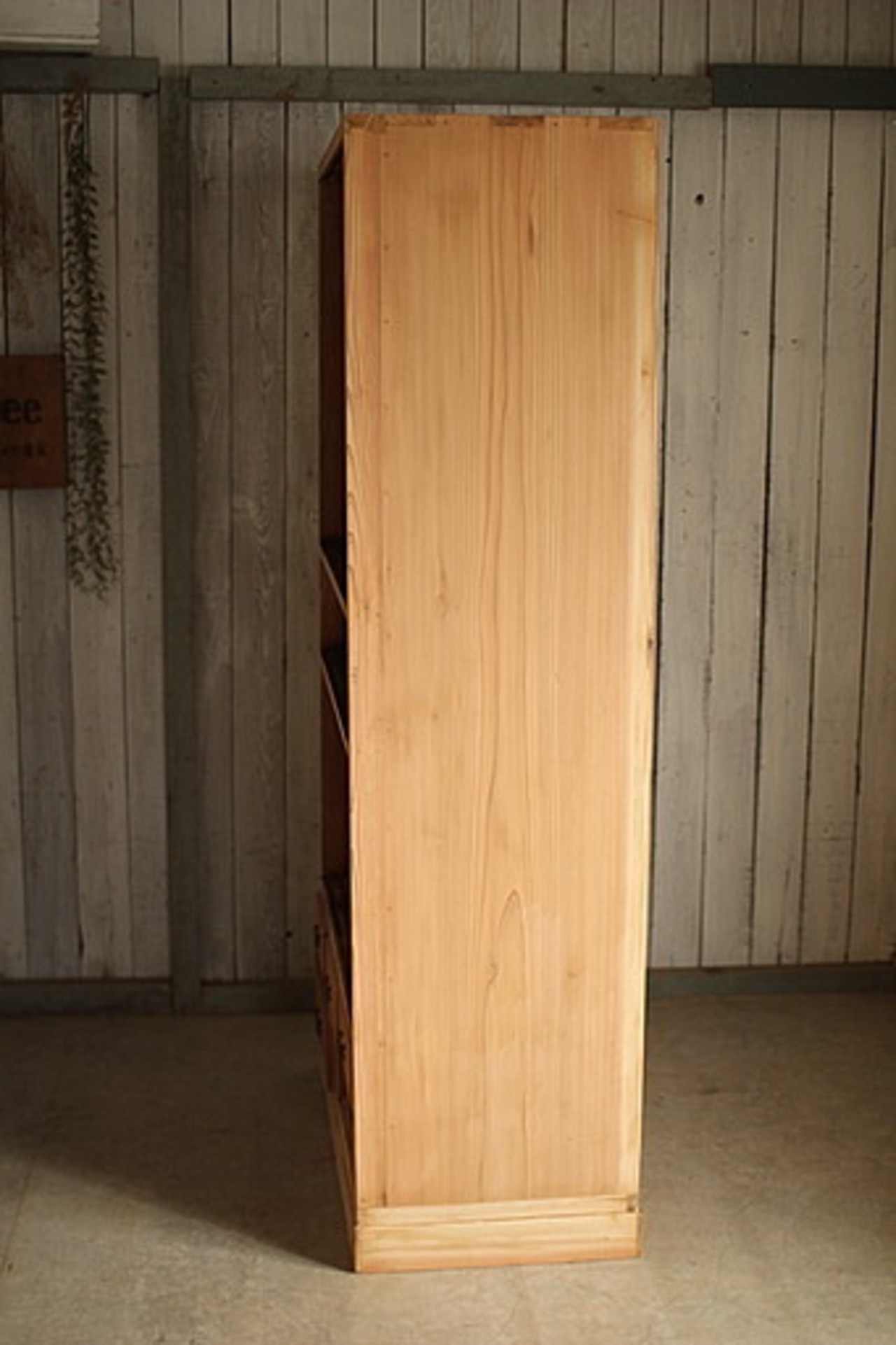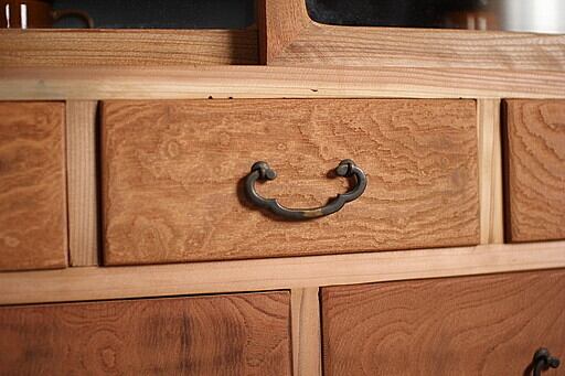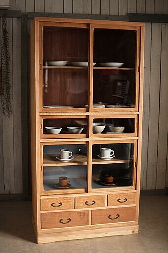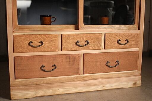 縦型の木枠ガラス戸棚×木製引き出し5杯